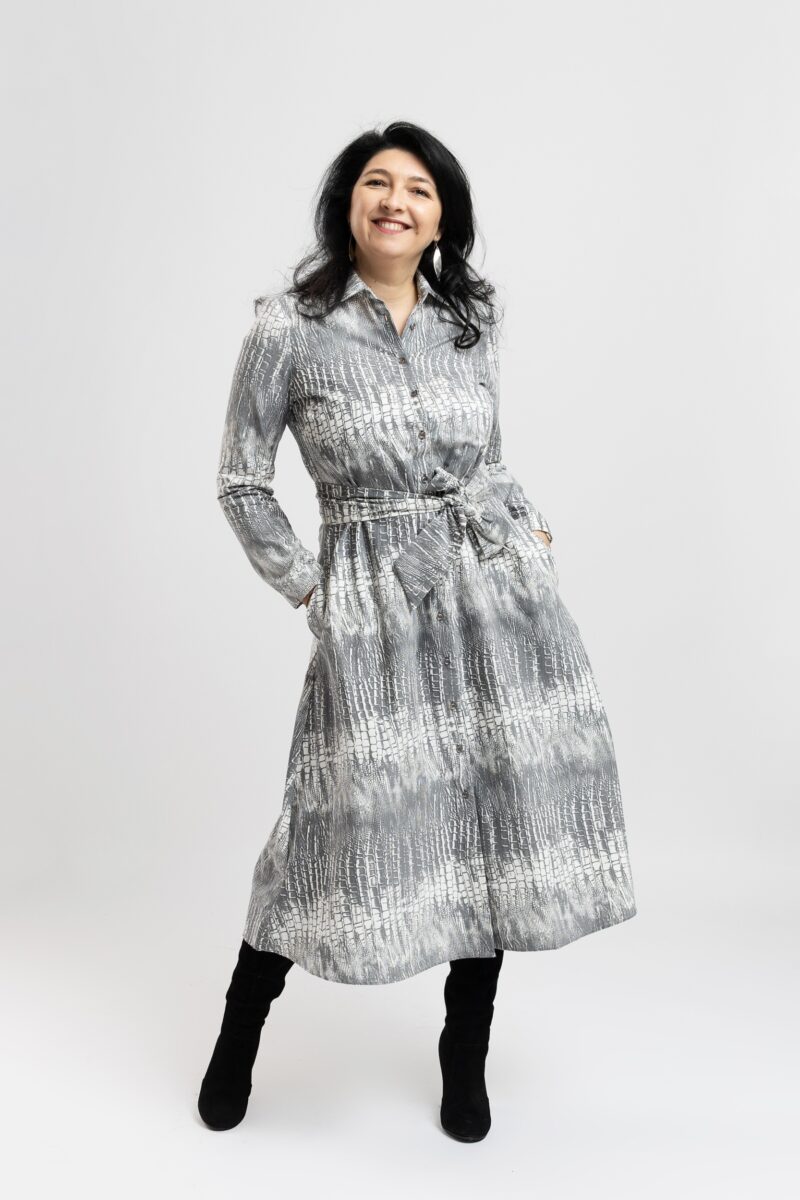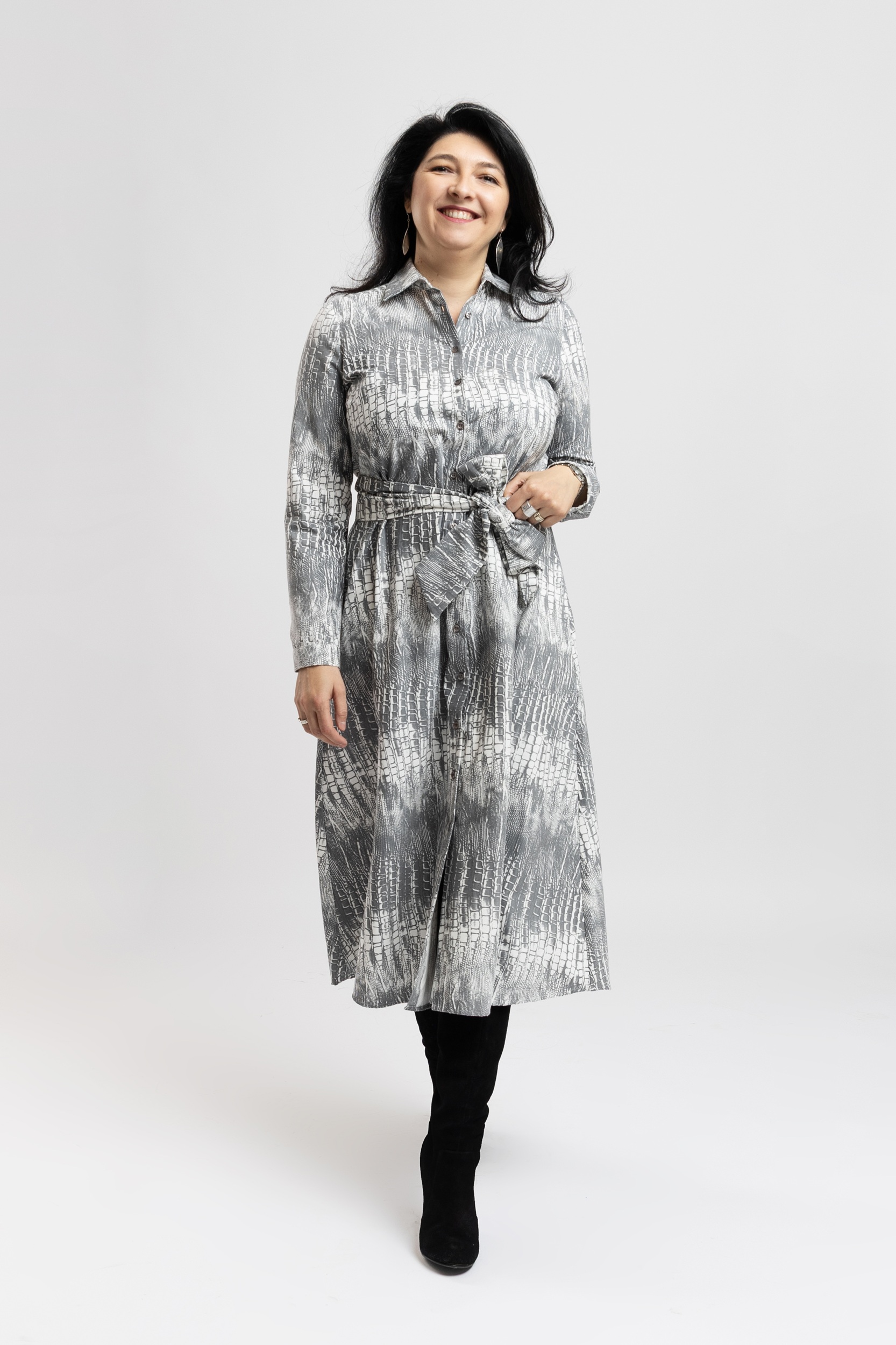 Această rochie cămașă cu print “ice queen” este alegerea perfectă dacă îți dorești o piesă care combină eleganța atemporală, confortul și un design contemporan ce atrage privirile. Ideală pentru ținute de zi, birou sau ieșiri casual cu un plus de stil. Alina poarta masura 42. Rochia o gasiti si in showroom-ul nostru din Str Imparatul Traian nr 32, et 2, Bucuresti.