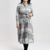 Piesa se remarcă printr-un print sofisticat ce imită gheata, realizat în nuanțe rafinate de alb, gri și antracit. Modelul are un efect vizual interesant: îmbină texturi fine, detalii grafice și un joc subtil de umbre, creând un imprimeu modern care evocă atât eleganța, cât și rafinamentul abstract al unui pattern artistic. Acest tip de print adaugă rochiei un aer contemporan, perfect pentru a ieși din tipare fără a fi prea strident.