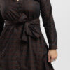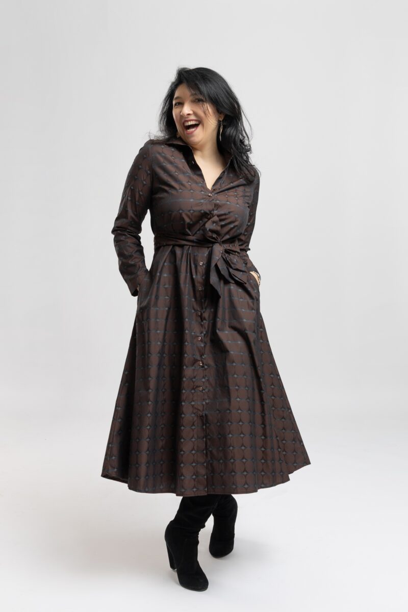 Designul cu nasturi pe toata lungimea si printul maro cu stele discrete albe transforma aceasta rochie intr-o piesa statement, ideala atat pentru birou, cat si pentru plimbari sau iesiri de weekend.