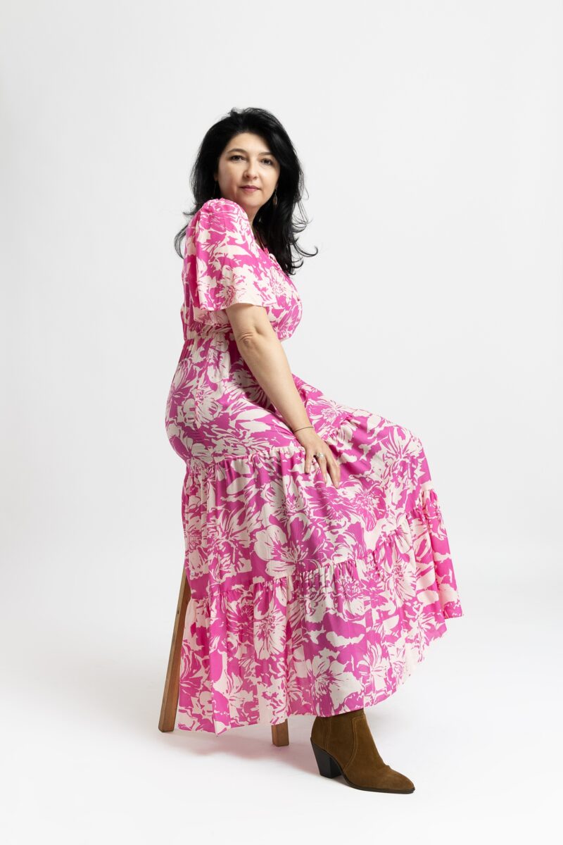 Rochia cu Volane Lisa, cu flori fucsia, este alegerea perfectă pentru femeile care iubesc culorile vii și ținutele care atrag priviri. Realizată din vâscoză fină și plăcută la atingere, această rochie îmbină lejeritatea cu eleganța într-o croială amplă și fluidă, care se așază perfect pe orice siluetă.
