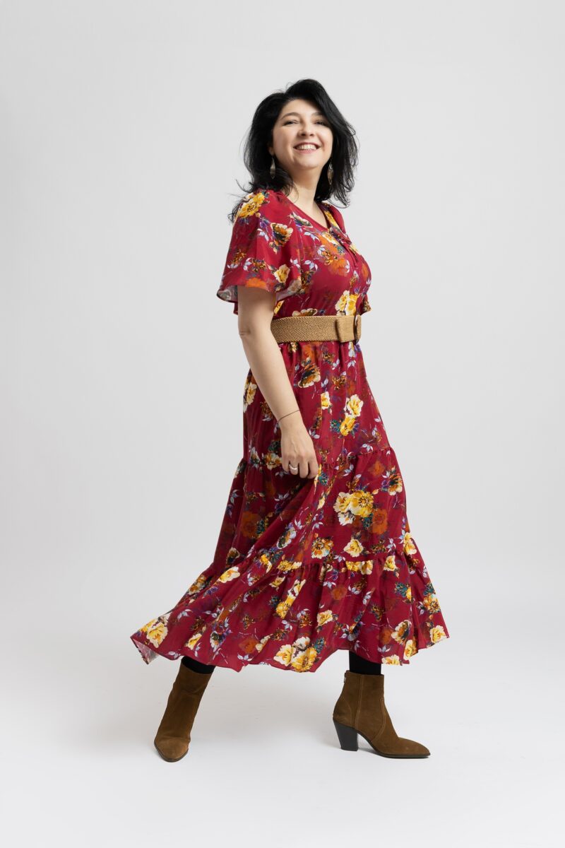 Rochia cu Volane Lisa, grena cu trandafiri colorati, este o piesă care aduce instantaneu bună dispoziție și rafinament. Realizată din vâscoză fină și respirabilă, această rochie oferă o senzație plăcută pe piele și o cădere fluidă, perfectă pentru femeile care iubesc confortul fără a renunța la stil.